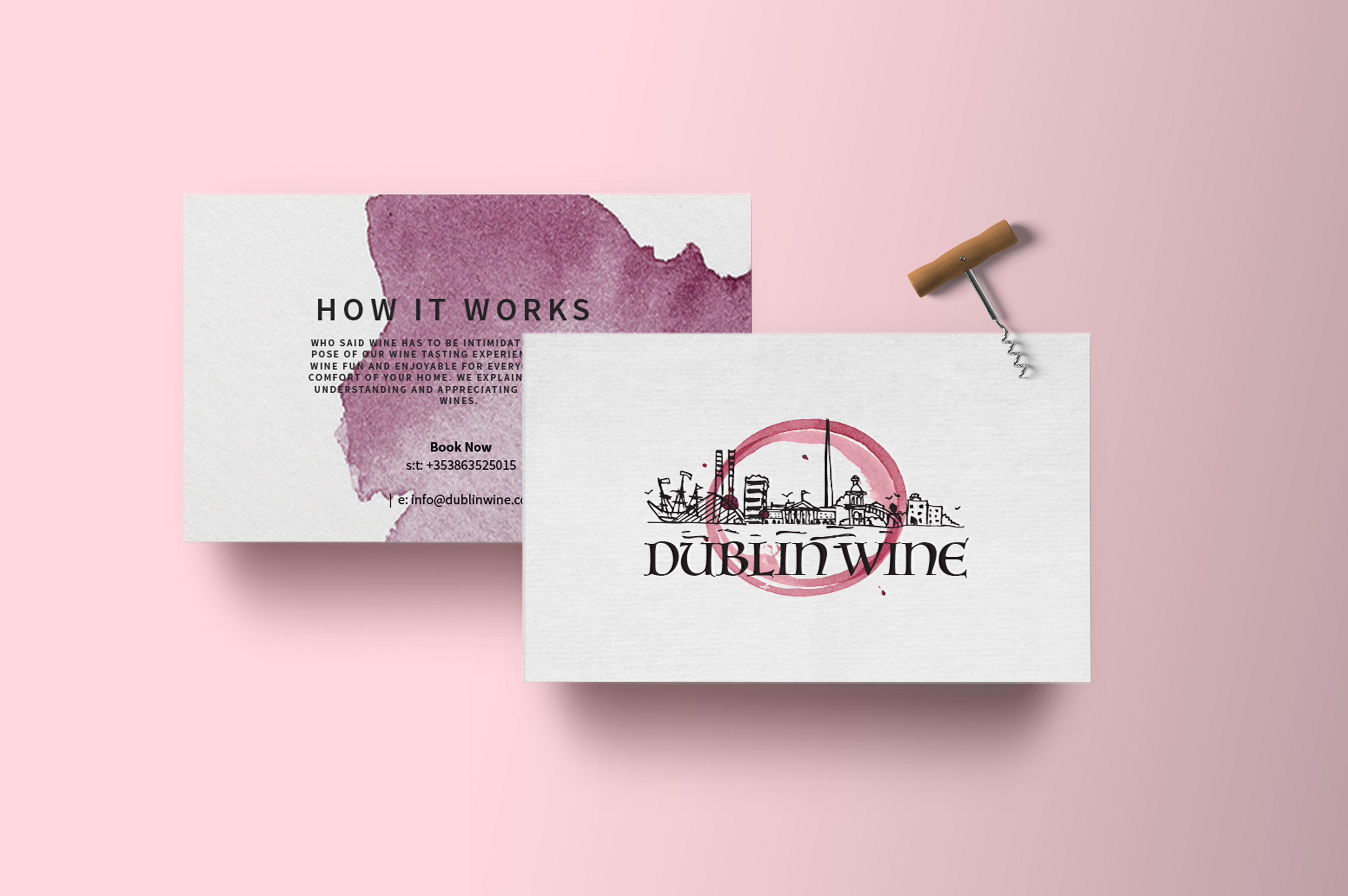One of the clients requests for the Dublin Wine logo was that it had to portrays the spirit of Dublin.. I looked at many different landmarks to portray the city, but in end the end I combined them all into one skyline. The hand-drawn lines of the skyline illustration compliment the ‘Celtic’ inspired typeface. The image of the wine spill acts as a visual stand-in for the costumers, while also providing color to the otherwise black & white color scheme. The logo works both alone, as a plain black or white logo on busy backgrounds, as well as combined with the wine spill as more of a statement.